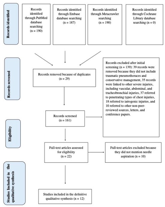 As a result of our search, we found 190 articles using the three MeSH terms “Pneumothorax” AND “Trauma” AND “Conservative Management”. However, 178 papers were excluded for the following reasons: (1) the articles did not address traumatic pneumothoraces and conservative management simultaneously, (2) the articles were linked to other severe injuries, including vascular, abdominal, and tracheobronchial injuries, (3) the articles referred to penetrating types of chest injuries, and (4) the articles referred to iatrogenic injuries. A meticulous analysis was conducted of 22 relevant publications evaluating conservative treatment for patients with a traumatic PTX. We selected 12 articles [13,14,15,16,17,18,19,20,21,22,23,24] where needle aspiration was also discussed as a conservative treatment option. We summarize all data extracted from these 12 studies in Table 1, which includes the first author, the year of publication, the study reference, patient groups, the study type, and outcomes and key results.