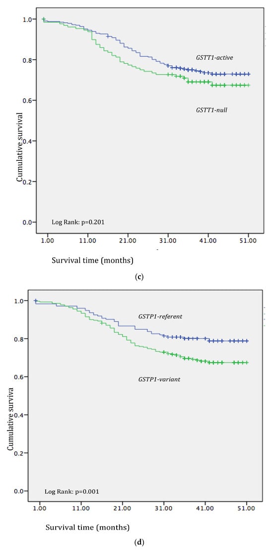 Kaplan–Meier analysis showed statistically significantly shorter overall survival in individuals with the GSTM1-null genotype when compared to carriers of the GSTM1-active genotype (log-rank: p = 0.001, Figure 1b). Additionally, the Kaplan–Meier analysis showed statistically significant shorter overall survival in carriers of the GSTP1 IleVal+ValVal (variant) genotype in comparison to individuals with the GSTP1 IleIle (referent) genotype (log-rank: p = 0.001, Figure 1d). However, no statistically significant effect of either GSTA1 or GSTT1 polymorphisms was observed in terms of overall survival (Figure 1a,c) in CRC patients (p > 0.05).