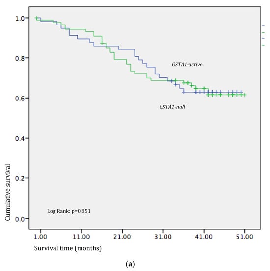 An additional focus of our study was the assessment of GSTA1 polymorphism in CRC, considering that it has been studied far less than other GST genetic variants. One of the first studies investigating the association between GSTA1 polymorphism and CRC development was that of Martinez et al., which showed that GSTA1 polymorphic expression does not influence CRC susceptibility [37]. Although meta-analyses regarding GSTA1 genetic variability and susceptibility to CRC development were conducted, studies regarding the association with the outcome in CRC patients are lacking [9,10]. Our results suggest that there is no significant effect of GSTA1 rs 3,957,357 genetic variation on overall survival in patients with CRC.