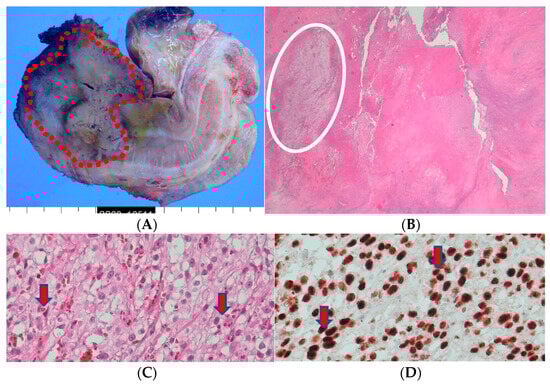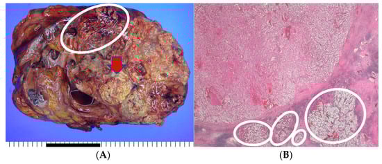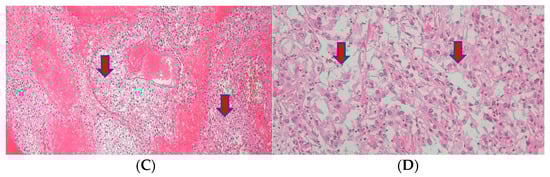 The excised tissue displayed the presence of an ill-defined firm mass (4.3 × 3.2 × 2.5 cm) at the penile shaft. However, the urethra and other parts of the prepuce skin were largely unremarkable. Upon inspection of the cut surface of the mass, gray-yellowish and necrotic features were observed, infiltrating into the corpus cavernosum and surrounding structures (Figure 5). The histopathological examination confirmed the presence of metastatic renal cell carcinoma, clear cell type, with extensive necrosis and hemorrhage and a clear surgical resection margin (Figure 5).