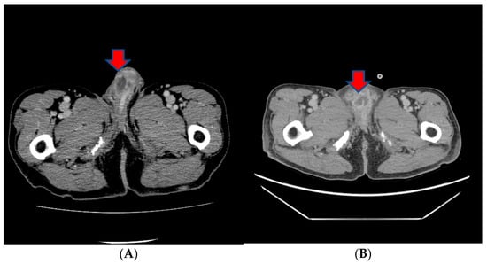 (A) A subsequent CT scan performed approximately 4 months later showing an increased size of the mass in the penis. (B) After radiation therapy, a follow-up CT scan showed the decreased size of the tumor.