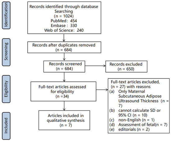 Initially, we identified a total of 1024 potential articles from the three databases. Following the removal of duplicates and the application of exclusion criteria based on titles and abstracts, 34 studies underwent a comprehensive review through full-article assessment for eligibility. Ultimately, seven articles were deemed eligible for inclusion in our meta-analysis. The exclusion criteria encompassed studies that solely measured maternal subcutaneous ultrasound thickness (7 studies), those lacking essential data such as (SD or 95% CI (10 studies), non-English language publications (1 study), assessments focused on fetal outcomes (7 studies), and editorial articles (2 studies).