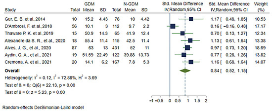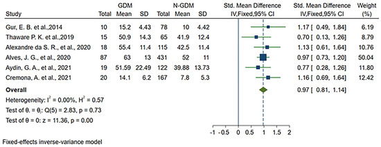 The essential characteristics of each study are summarized in Table 1. Among the seven studies included, there were 225 pregnant women diagnosed with GDM and 1090 non-GDM pregnant women. Six of these studies [10,11,12,14,15,16] were prospective cohort studies, while one [13] was a case-control study. The ultrasound examinations in six studies [10,11,12,14,15,16] were conducted at ≤20 weeks, whereas one study [13] performed the ultrasound at the gestational age of 24–28 weeks. All studies employed the oral glucose tolerance test (OGTT) for GDM diagnosis, with only one study [12] utilizing its own diagnostic criteria, while the others [10,11,13,14,15,16] adhered to the International Association of Diabetes and Pregnancy Study Groups (IADSPG) screening criteria.