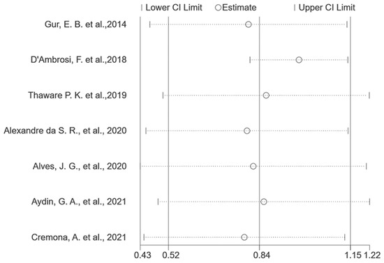 We conducted a sensitivity analysis by systematically removing one included study at a time to investigate the influence of each study on the overall merged effect, as illustrated in Figure 3 and summarized in Table 3. While Figure 3 suggests that the meta-analysis results remained stable and reliable, a noteworthy observation is that the I2 decreased to 0 (p = 0.73) when one study [13] was excluded, as indicated in Table 3.