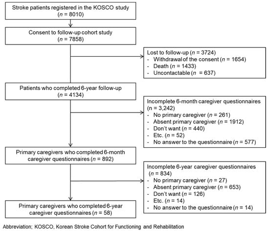 Of the 8010 patients enrolled in the KOSCO study, 7858 of them agreed to a long-term follow-up. Among the 7858 patients, 4134 patients who completed face-to-face interviews at 6 years post-stroke were screened. The follow-up time points were at discharge and 7 days, 3 months, 6 months, 12 months, 18 months, 24 months, 36 months, 48 months, 60 months, and 72 months from onset of stroke. Among the primary caregivers, 892 caregivers responded to the survey at 6 months post-stroke, and 58 of them also responded at 6 years post-event (Figure 1). Using the data from the final 58 patient/caregiver pairs, changes in caregiver burden and its predictors over time were analyzed.
