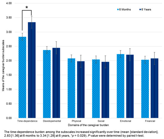 A high caregiver burden, which suggests a risk of burnout, was reported by 37.9% and 51.7% of caregivers at 6 months and 6 years post-stroke, respectively (Table 4 and Figure 2). Among the six domains of burden, time-dependence and developmental domain scores remained consistently the highest for up to 6 years. Both the caregiver burden total score and proportion of caregivers at risk of burnout did not decrease between 6 months and 6 years. The time-dependence burden was increased over time (mean [SD], 2.83 [1.36] to 3.34 [1.28], p = 0.029).