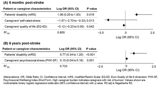 Multivariable regression analysis with significant factors was performed to evaluate caregiver burden predictors at 6 months and 6 years (Table 6 and Figure 3). The following were identified as independent caregiver burden predictors at 6 months: patients’ disability (mRS) (odds ratio (OR) = 11.60; 95% confidence interval (CI) 1.58–85.08; p = 0.016), caregivers’ self-rated stress (OR = 0.03; 95% CI 0.00–0.47; p = 0.013), and caregivers’ quality of life (EQ-5D) (OR = 0.76; 95% CI 0.59–0.99; p = 0.042). At 6 years, only the patients’ disability (mRS) (OR = 5.88; 95% CI 2.19–15.82; p < 0.001) and caregivers’ psychosocial stress (PWI-SF) (OR = 1.26; 95% CI 1.10–1.44; p = 0.001) showed significance. At both time points, caregiver burden could be explained by more than 70% of the regression equation (85.5% at 6 months; 73.3% at 6 years).