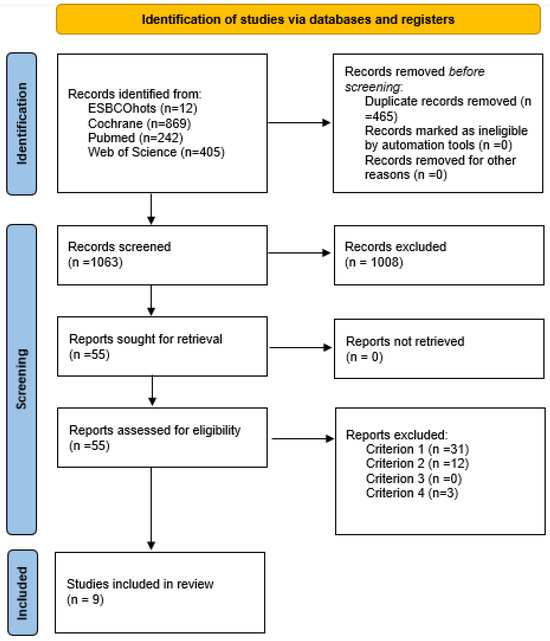 Figure 1 presents the flowchart for systematic reviews proposed by the PRISMA Declaration. A total of 1528 potential articles were identified. Subsequently, after the exclusion of duplicates from the databases, the selection and eligibility criteria were applied. Finally, nine articles were included for the narrative synthesis of this review [40,41,42,43,44,45,46,47,48].