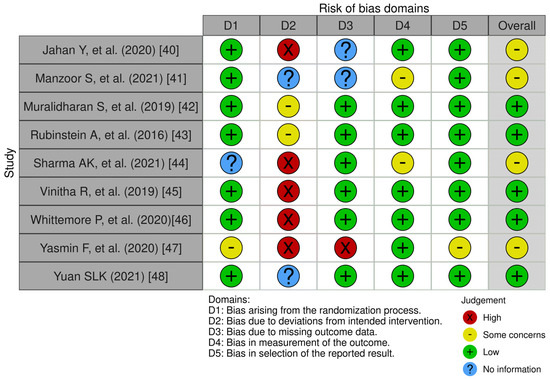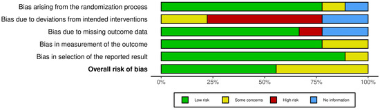 The results of the nine randomized clinical trials included in this review are presented based on the domains proposed by the Cochrane manual. Risk of bias analysis revealed that the distribution of biases classified as “low risk or some concerns” was similar across the domains: (D1) selection bias, (D4) attrition risk, and (D5) reporting bias. In the detection bias domain (D3), articles were detected without sufficient information to make a conclusion regarding the bias (2/9). On the other hand, in the performance bias domain (D2), a high percentage of articles with “high risk” were detected (5/9) (Figure 2 and Figure 3).