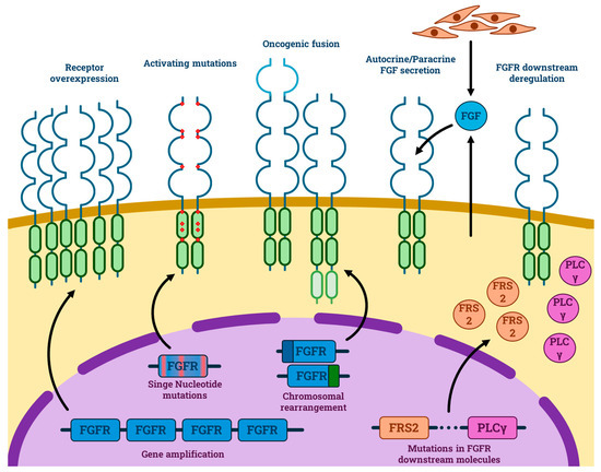 FGFR pathway dysregulation leading to cancerogenesis. The FGF receptor could be hyperactivated due to different events: receptor overexpression due to gene amplification; activating single nucleotide mutations (red spots); creation of constitutively active fusion proteins from chromosomal rearrangement (light green and light blue parts of the receptor); autocrine or paracrine FGF secretion; dysregulation of the downstream elements.