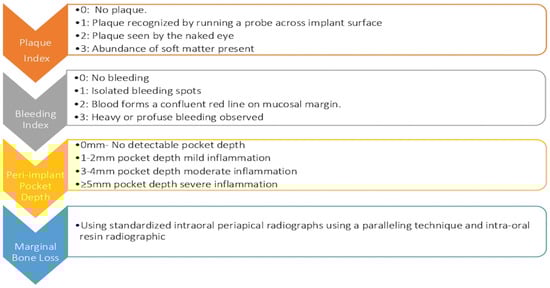 Schematic diagram of indexes used to measure peri-implant clinical parameters.