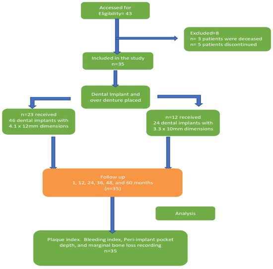 All implants were placed using a surgical positioning and placement stent (copy of existing denture), by a board-certified prosthodontist, trained in implant surgery. The implants were placed using the implant surgery protocol of 16 weeks or beyond after extraction. Surgery comprised of sterile procedure with local anesthesia, mid-crestal incision, mucoperiosteal flap, osteotomy (using the protocol recommended), implant placement (inter foramina) at canine location, submerged implant placement, torqued fixture (Straumann Holding, SLActive, Basel, Switzerland) subcrestal, appropriate healing abutment, and interrupted absorbable sutures (Vicryl, Ethicon, Johnson & Johnson, New Brunswick, NJ, USA). Implants among patients included 4.1 × 12 mm (Straumann Holding, Basel, Switzerland) in 23 patients (n = 46) and 3.3 × 10 mm (Straumann Holding, Basel, Switzerland) in 12 patients (n = 24).
