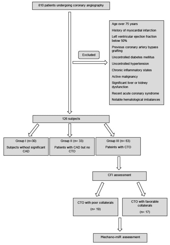 In this two-center observational study, the association between mechano-miRs and the collateral vessel development in CTO patients was examined. The objective of this study was to understand the molecular mechanisms driving collateral circulation in CTOs. Of 810 patients undergoing coronary angiography, 126 were selected based on stringent criteria. These included excluding those with a history of myocardial infarction, a left ventricular ejection fraction below 50%, or a previous coronary artery bypass grafting. Additionally, exclusion criteria encompassed an age over 75, uncontrolled diabetes mellitus, uncontrolled hypertension, chronic inflammatory states, active malignancy, significant liver or kidney dysfunction, recent acute coronary syndrome, and notable hematological imbalances (Figure 1). This careful selection ensured a homogenous group for accurate cardiac analysis. The study population was categorized into three groups: 30 subjects without significant coronary artery disease (Group I), 33 with CAD but no CTO (Group II), and 63 with a CTO (Group III).