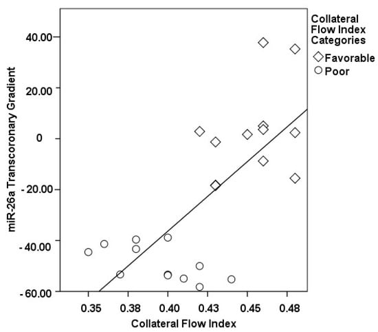The correlation between the transcoronary gradient of miR-26a and the CFI.