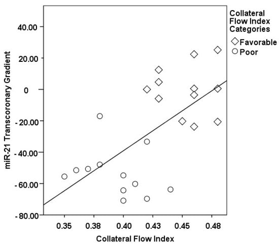 The correlation between the transcoronary gradient of miR-21 and the CFI.