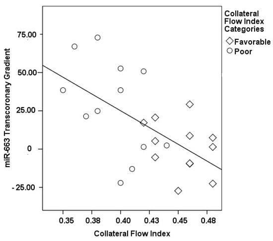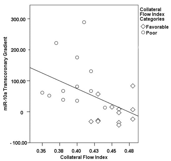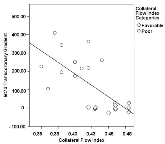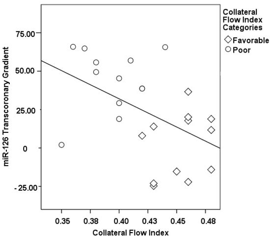 Notably, significant differences were observed in the transcoronary gradients of mechano-miRs and various cytokines, with TGF-β and miR-126 showing a substantial disparity between the groups (p = 0.003 and p < 0.001, respectively). Moreover, the gradients of miR-10a, miR-19a, miR-21, miR-23b, miR-26a, miR-92a, miR-130a, miR-663, and let7d were all significantly associated with the collateral flow quality (p < 0.05 for all), suggesting that these biomarkers may play crucial roles in the development or function of collateral circulation. VEGF showed a significant transcoronary gradient difference between the two groups (p = 0.006).