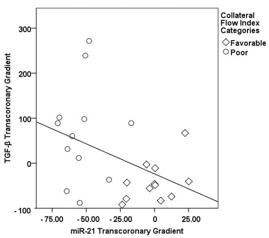 The correlation between the transcoronary gradients of miR-21 and TGF-β.