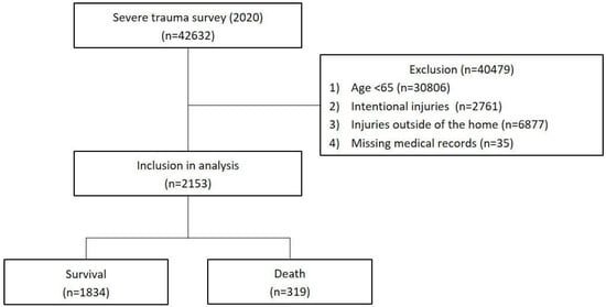 This study used data (released in June 2023) from patients injured during the period 1 January–31 December 2020. Data were collected from 15 emergency medical facilities (regional trauma centers, community emergency medical centers, etc.). Of the 42,632 records collected in 2020, the final analysis included a total of 2153 patients aged 65 and older with accidental injuries at home, excluding 30,806 under the age of 65, 2761 intentional injuries, 6877 injuries outside of the home, and 35 missing medical records (Figure 1).