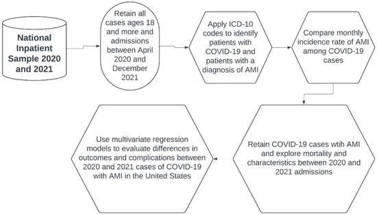 The primary outcome was all-cause mortality among COVID-19 patients with AMI. We further explored the use of coronary artery bypass graft surgery (CABG), percutaneous coronary intervention (PCI), mechanical ventilation, intra-aortic balloon pump (IABP), and events of acute kidney injury (AKI), cardiogenic shock, cardiac arrest, and cardiac arrhythmias (atrial fibrillation, ventricular fibrillation, and supraventricular tachycardia) in these patients. The mean length of stay (LOS) and their mean hospital charges were also compared. The complications and outcomes were evaluated via multivariable regression analyses as an adjusted odds ratio (aOR) along with their 95% confidence interval (95% CI) and p-value. We retained statistical significance for p < 0.05 throughout the study. The analyses were performed using SPSS 29.0 (IBM Corp., Armonk, NY, USA) and STATA 18.0 MP (StataCorp LLC, College Station, TX, USA) (Figure 1).