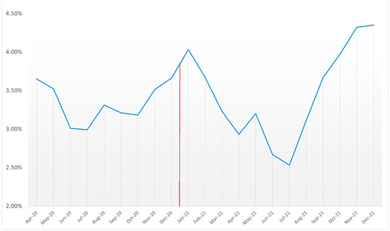 Mortality rates among COVID-19 cases with AMI between April 2020 and December 2021 (red line denotes FDA approval of COVID-19 vaccines).