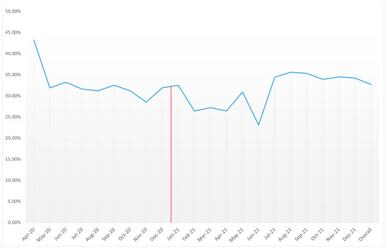 The overall mortality rate fluctuated between the 21 months of the study. The initial mortality rates in April 2020 were relatively high at 43.20%, gradually decreasing over subsequent months before reaching a low of 23.1% in June 2021. However, from July 2021 onwards, mortality rates experienced an increase, peaking at 35.6% in August 2021. Despite these fluctuations, statistical significance was not observed across the study period (ptrend = 0.103), averaging at 32.70% over the study period (Table 3, Figure 3).