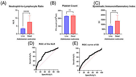Comparison of key parameters between survivors and non-survivors. (A) A comparison between the NLR of patients who survived (blue column) and to those who passed away (red column). (B) Comparisons of platelet count and (C) the systematic immunoinflammatory index between survivors and non-survivors. The ROC curves of (D), the NLR and (E) the SII, demonstrating their sensitivity and specificity in differentiating between survivors and non-survivors. NLR: Neutrophil-to-Lymphocyte Ratio, ns: Non-significant, Plt: Platelet, ROC: Receiver Operating Curve, SII: Systematic Immunoinflammatory Index. *** denotes a statistically significant difference at a p-value < 0.001. **** denotes a statistically significant difference at a p-value < 0.0001.