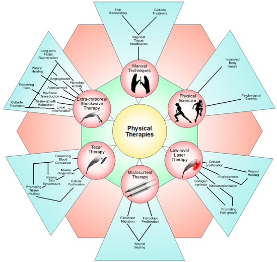Physical therapies play a pivotal role in addressing both functional impairments and aesthetic concerns. From techniques targeting subcutaneous adipose tissue to specialized interventions aimed at wound and scar management, physical therapies offer benefits that extend beyond pain relief to include improvements in aesthetics. Figure 1 shows the different physical therapies utilized in the rehabilitation field and their corresponding biological effects.