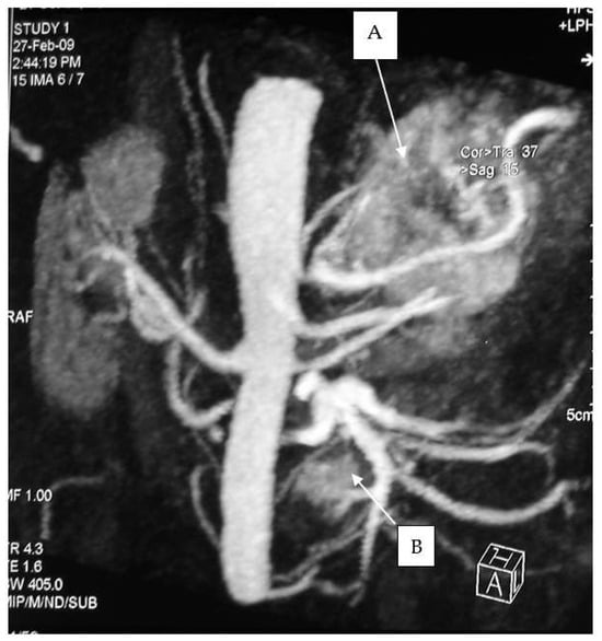 The diagnostic localization of a PCC/PGL is traditionally attempted only once excess catecholamine has been biochemically ascertained [,]. Both computed tomography (CT) scanning and MRI are mainstays for adrenal imaging and are used as the primary tests for localizing catecholamine-secreting tumors. CT is the preferred method for its excellent resolution (Figure 3 and Figure 4).