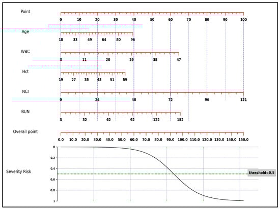 The results were analyzed using SPSS software 20.0 and MedCalc software 22.0. Normality was assessed by means of the Shapiro–Wilk test. For quantitative variables, data were presented as the mean ± standard deviation for normally distributed data and median ± standard error of the mean or median (interquartile range (IQR)) for non-normally distributed data. The groups were compared using the Student’s t test or the Mann–Whitney U test (2 categories) or ANOVA or the Kruskal–Wallis test (>2 categories). In the case of qualitative variables, the associations were verified using the Chi-square test or Fisher’s exact test. The area under the receiver operator characteristic (AUROC) curve was used to identify optimal cut-off values for NCI, NLR, and other laboratory parameters to recognize maximum sensitivity, specificity, positive predictive value (PPV), negative predictive value (NPV), and accuracy for AP severity. The DeLong test was used to compare the AUROCs. Multivariate logistic regression analysis was performed to evaluate the independent predictive value for AP severity among the variables that showed significant differences in univariate analysis. A nomogram was created according to the regression analysis results using a Python-based online program (https://visdata.bjmu.edu.cn/nomogram) (accessed on 18 January 2024) to assess the severity of AP. The discrimination of the model was assessed using the AUROC curve. A p value of less than 0.05 indicated statistical significance.