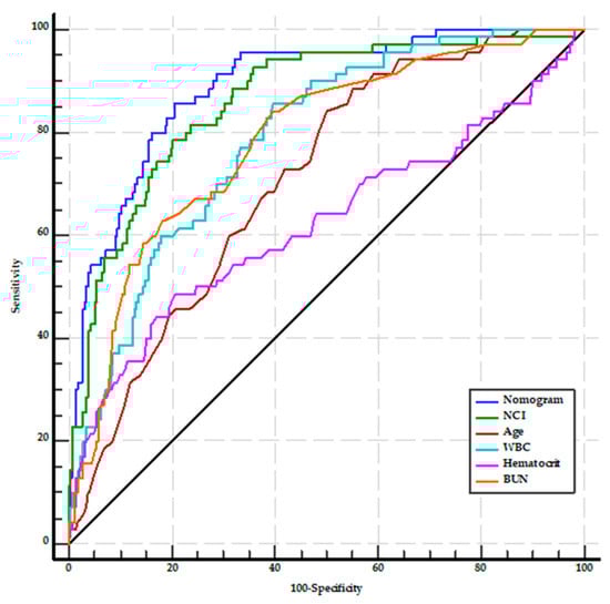 A nomogram was constructed using the results of the multivariate analysis to estimate the likelihood of severity in patients with AP (Figure 1). The scores were constructed using five independent factors, and the estimated severity risk was calculated by summing the scores of each factor with the weight equal to the OR value. The final score ranged from a minimum of 0 points to a maximum of 150 points. The AUROC of the nomogram was 0.891 (95% CI: 0.858–0.919), with sensitivity, specificity, PPV, NPV, and accuracy of 85.7%, 79.5%, 45.5%, 96.5%, and 80.5%, respectively. It was higher than the AUROC values for age (0.709, 95% CI: 0.663–0.752), WBC, BUN, and hematocrit (for all, p < 0.001). On the other hand, the AUROC of the nomogram did not significantly differ from the AUROC of the NCI (p = 0.077) (Figure 2).