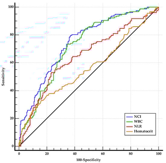 Regarding the studied laboratory parameters, the WBC, neutrophil, hemoglobin, hematocrit, creatinine, NLR, and NCI levels were significantly higher in the MSAP group than in the MAP group (for all, p < 0.05) (Table 5). Among the statistically significant laboratory parameters, WBC, hematocrit, NLR, and NCI were investigated using ROC analysis. The optimal cut-offs for predicting the MSAP group were as follows: WBC > 10,840/mm3 (AUC: 0.723, 95% CI: 0.674–0.768, p < 0.001); hematocrit > 43.3 (AUC: 0.566, 95% CI: 0.514–0.607, p = 0.032); NLR > 10.95 (AUC: 0.649, 95% CI: 0.598–0.698, p < 0.001); and NCI ≥ 6.76 (AUC: 0.749, 95% CI: 0.701–0.792, p < 0.001) (Figure 3). The sensitivity, specificity, PPV, NPV, and accuracy of NCI were 79.7%, 62.9%, 43.7%, 61.5%, and 80.7%, respectively (Table 6). The ability of NCI to distinguish MSAP from MAP was superior to that of NLR and hematocrit (for both, p < 0.01) and was similar to that of WBC (p = 0.13). The AUROCs of the combinations of NCI with WBC, NLR, and hematocrit (0.753, 0.750, and 0.739, respectively) were not superior to the AUROC of NCI (for all, p > 0.05).