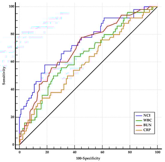 From the laboratory parameters at admission, the WBC (p = 0.002), neutrophil count (p = 0.002), BUN (p < 0.001), creatinine (p < 0.001), CRP (p = 0.030), and NCI (p < 0.001) levels were significantly different between the SAP and MSAP groups (Table 5). Among the statistically significant laboratory parameters, WBC, BUN, CRP, and NCI were investigated using ROC analysis. The optimal cut-offs for predicting the SAP group were as follows: WBC > 14,900/mm3 (AUC: 0.649, 95% CI: 0.579–0.713, p < 0.001); BUN > 17.5 (AUC: 0.703, 95% CI: 0.621–0.785, p < 0.001); CRP > 81.3 (AUC: 0.602, 95% CI: 0.532–0.669, p = 0.029); and NCI > 15.62 (AUC: 0.742, 95% CI: 0.676–0.800, p < 0.001) (Figure 4). The best threshold for predicting SAP was the AUROC of NCI. Although there was no difference between the AUROCs of NCI and BUN (p = 0.38), NCI was more effective than WBC and CRP (for both, p < 0.01). The differences between WBC, BUN, and CRP were not significant (p > 0.05). In the comparison of the AUROCs, the combinations of WBC, BUN, and CRP with NCI (0.744, 0.755, and 0.741, respectively) did not differ from that of the AUROC of NCI (for all, p > 0.05) (Table 8).