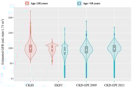 Table 1 shows the distribution of clinical and laboratory parameters by age group. The median values of sCr concentration ranged from 0.68 to 0.81 mg/dL in the study population; sCr concentration showed higher values in males than in females across each age group (0.74–0.95 mg/dL vs. 0.62–0.71 mg/dL), with the lowest values found in the age group ≤18 years. Figure 1 shows the distribution of eGFR using each equation. In the age group >18 years, the CKD-EPI 2021 equation showed the highest value, followed by the CKD-EPI 2009 and EKFC equations (median [IQR]; 99.29 [88.56–109.94] vs. 94.68 [83.55–106.13] vs. 90.69 [78.88–102.55] mL/min/1.73 m2, respectively). In the age group ≤18 years, the median (IQR) eGFR values using the CKiD and EKFC equations were 98.00 (86.21–110.74) and 100.09 (89.61–108.67) mL/min/1.73 m2, respectively. Although the difference of median eGFR values was 2.09 mL/min/1.73 m2, the distribution of eGFR values showed a more than two-fold wider range when using the CKiD equation than using the EKFC equation (range, 172.74 vs. 84.81 mL/min/1.73 m2). Differently from the EKFC equation, the CKiD equation showed the long-tailed outside points above the upper adjacent value.