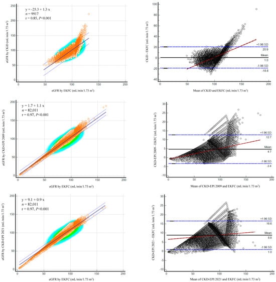 Table 2 shows the comparison of eGFR using each equation. In the total population, the CKD-EPI 2021 equation yielded the highest eGFR value, followed by the CKD-EPI 2009 and EKFC equations. Such findings were constantly observed when they were stratified into subgroups of sex, age, and BMI. Generally, the eGFR values tended to decrease with increasing age among adults; however, eGFR values found by the EKFC equation increased slightly in the young adult population (age: 19–40 years). As BMI increased, the eGFR value decreased except for in the severely obese group (BMI > 30 kg/m2). The frequency of KDIGO categories according to each eGFR equation is presented in Table 3. In the adult population, the combined proportion of G1 and G2 was 96.2% by the CKD-EPI 2009, 97.4% by the CKD-EPI 2021, and 94.7% by the EKFC equation, showing significant differences (all p < 0.0001). Each equation showed weak or moderate agreement on the frequency of KDIGO categories (κ = 0.54 between the EKFC and CKD-EPI 2021; κ = 0.77 between the EKFC and CKD-EPI 2009). In children, the combined proportion of G1 and G2 was same (99.8%) by both the CKiD and EKFC equations, although each G1 and G2 proportion showed significant differences between the CKiD and EKFC equations (all p < 0.0001).