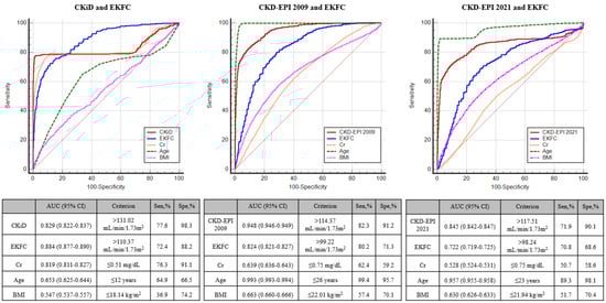 Data were expressed as median and interquartile range (IQR) for continuous variables and as numbers and percentages for categorical or binary variables. All continuous variables were tested for normality using Kolmogorov–Smirnov nonparametric tests. The full distribution of eGFR was displayed using violin plots with summary statistics, and the data probability density at different values was compared using survey strata by sex, age group (≤18, 19–25, 26–40, 41–60, and >60 years), and body mass index (BMI: kg/m2; <18.5, 18.5 to <23.0, 23.0 to <25.0, 25.0 to <30.0, and ≥30.0). The agreement on frequency of the KDIGO categories according to each eGFR equation was assessed using Cohen’s kappa (κ) with 95% confidence interval (CI), which was interpreted as follows: ≤0.20, none; 0.21–0.39, minimal; 0.40–0.59, weak; 0.60–0.79, moderate; 0.80–0.90, strong; and >0.90, nearly perfect []. The eGFRs by different equations were compared using the Passing–Bablok regression and Bland–Altman plots, according to the CLSI guidelines (EP09-ED3) []. The scatter plots were used to identify the correlation or difference between equations. In the Passing–Bablok regression, the correlation coefficients (r) were interpreted as follows: <0.30, negligible; 0.30–0.49, low; 0.50–0.69, moderate; 0.70–0.89, high; and ≥0.90, very high correlations []. In the Bland–Altman plots, the results were interpreted informally to observe how big the mean difference is and whether there is a trend of difference []. Using the receiver operating characteristic (ROC) curve analyses, the area under the curve (AUC) of each variable (eGFR equations, sCr, age, and BMI) was compared for predicting >95% difference between the two eGFR equations. The Mann–Whitney U test and Chi-squared test were used to compare variables or proportions, as appropriate. Statistical analyses were conducted using the MedCalc Statistical Software (version 22.019, MedCalc Software Ltd., Ostend, Belgium), and a two-tailed p value < 0.05 was considered statistically significant.