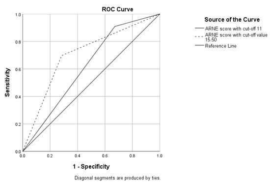 The ROC curves showing the specificity and sensitivity of the ARNE score with the official and the new cut-off values: the ARNE score with a cut-off value of 11 and AUC = 0.619 (95% CI 0.517–0.730, p < 0.054); the ARNE score with a cut-off value of 15.50 and AUC = 0.707 (95% CI 0.596–0.817, p = 0.001).