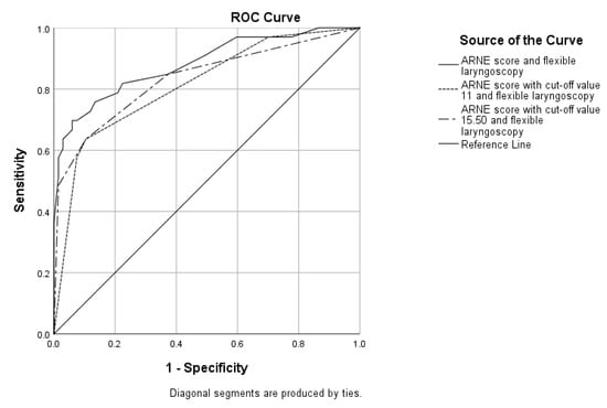 The ROC curves showing the specificity and sensitivity of combination between flexible laryngoscopy and the ARNE score with and without the cut-off values: flexible laryngoscopy and the ARNE score with AUC = 0.882 (95% CI 0.806–0.957, p < 0.0001); flexible laryngoscopy and the ARNE score with a cut-off value of 11 and AUC = 0.813 (95% CI 0.721–0.905, p < 0.0001); flexible laryngoscopy and the ARNE score with a cut-off value of 15.50 and AUC = 0.833 (95% CI 0.740–0.926, p < 0.0001).