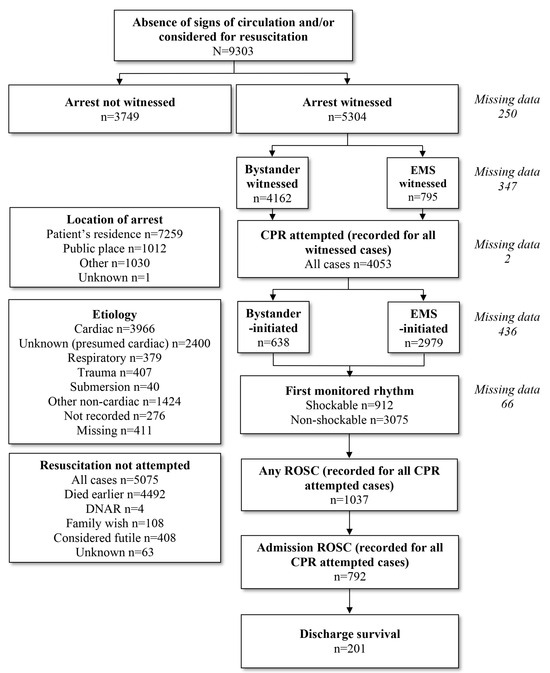 - Alm-Kruse, K.; Tjelmeland, I.; Kongsgård, H.; Kvåle, R.; Kramer-Johansen, J. Case completeness in the Norwegian Cardiac Arrest Registry. Resusc. Plus 2021, 8, 100182. [Google Scholar] [CrossRef] [PubMed]