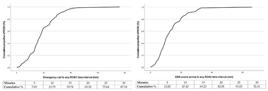 Cumulative proportion of return of spontaneous circulation (%) over time (min) in patients with out-of-hospital cardiac arrest—Return of spontaneous circulation was achieved in 50% of patients within 17 min after emergency call (left) and 10 min after emergency medical team arrival on scene (right) (Legend: ROSC—return of spontaneous circulation).
