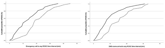 Cumulative proportion of return of spontaneous circulation (%) over time passed from emergency call (left) and emergency medical team arrival on scene (right) (min) in out-of-hospital cardiac arrest patients with survival to hospital discharge and patients who died, compared with log-rank test (p < 0.001 and p < 0.001, respectively) (Legend: ROSC—return of spontaneous circulation; solid line—survived to discharge; dotted line—died).