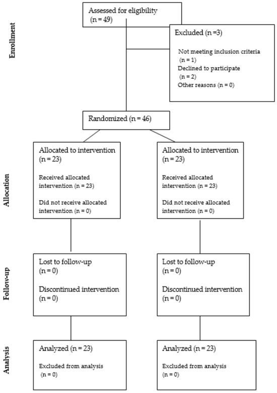 A total of 46 patients were included in this study: 23 women in the PRP group and 23 in the placebo group. The CONSORT flowchart for patient recruitment and analysis is presented in Figure 1.
