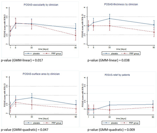 Statistical analysis was run using the intent-to-treat (ITT) approach. The basic characteristics of the study participants were presented by descriptive statistics using the mean with standard deviation for continuous variables and numbers with percentages for categorized variables. Next, as the investigated sample size was low, which is associated with low power while testing for normal distribution, the nonparametric U-Mann–Whitney test was used for continuous variables. The chi-squared test for categorical variables was run if the assumption of expected values being no more than 5 was met; otherwise, Fisher’s exact test was used. As there were repeated observations made on the 8th, 30th and 90th days, the repeated measures ANOVA was used to reveal the presence of difference in the POSAS scores. Finally, the growth mixture models with a linear prediction of dependent variable changes over time were run to answer the questions of whether the curves representing the change in the POSAS score over time differ by groups when the distances in time-point measures are considered. If the linear prediction was not observed, the quadratic prediction was tested as well (assuming that the nature of the change may be not clearly linear, but also like a quadratic function). A value of p < 0.05 was taken as the significance level in the above-mentioned analyses.