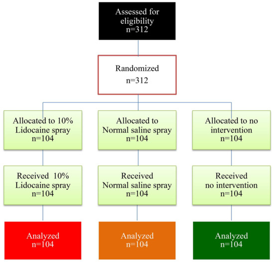 Of the 312 women, 104 were randomly assigned to the lidocaine spray group, 104 to the normal saline solution spray group and 104 to the control group (no-intervention). There were no dropouts in this study, as presented in Figure 1.