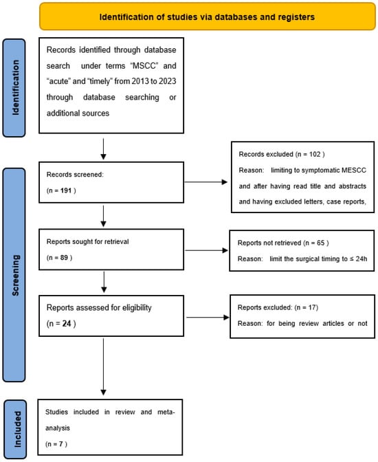 APA StyleBresolin, N., Sartori, L., Drago, G., Pastorello, G., Gallinaro, P., Del Verme, J., Zanata, R., & Giordan, E. (2024). Systematic Review and Meta-Analysis on Optimal Timing of Surgery for Acute Symptomatic Metastatic Spinal Cord Compression. Medicina, 60(4), 631. https://doi.org/10.3390/medicina60040631