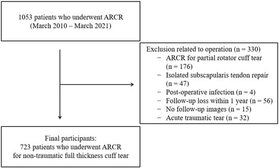 This retrospective study was conducted between March 2010 and March 2021 in patients diagnosed with rotator cuff tears who underwent ARCR. The authors searched the ICD-10 code (M751) and surgical codes (N0935, N0936, N0937, and N0938) to identify patients who underwent ARCR. In total, 1053 patients with rotator cuff tears were identified. The inclusion criteria were as follows: (1) history of ARCR for nontraumatic rotator cuff tear, (2) follow-up period ≥1 year, and (3) retear diagnosed by magnetic resonance imaging (MRI) or ultrasonography within 1 year. The exclusion criteria were as follows: (1) history of ARCR for partial rotator cuff tear, (2) isolated tear of the subscapularis tendon, (3) postoperative infection, (4) acute traumatic rotator cuff tear (definite trauma history and MRI findings [bone bruise, hemarthrosis, and edema in the rotator cuff or muscle]), (5) lack of a 1-year follow-up period, and (6) MRI or ultrasonography examination not performed to confirm a retear within 1 year. Finally, 723 patients who underwent ARCR for a rotator cuff tear were retrospectively analyzed (Figure 1).