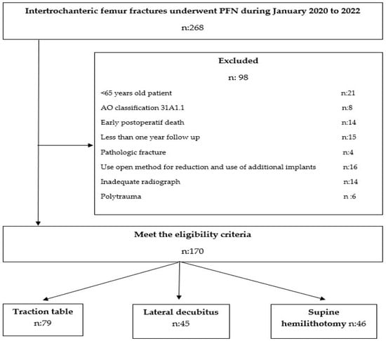 The exclusion criteria were as follows: pathologic fractures, open fractures, the utilization of open methods during surgery, the use of additional implants, infection in the incision area, blood diseases, polytrauma, and severe acute or chronic inflammatory diseases. The patients who underwent PFN surgery conducted by experienced surgeons were categorized into three groups according to the surgical position: supine hemilithotomy, traction table, and lateral decubitus. The preference for different surgical positions was informed by the variation in methods familiar to surgeons trained in different clinics. Patients with accessible complete medical records were included in the study.