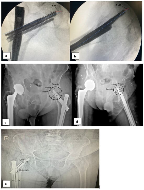 Methods of measuring TAD values. TAD = [Xap × (Dtrue/Dap)] + (Xlat × (D true/Dlat)] (Dtrue = known diameter of the lag screw) (a,b). Determination of quadrant in the anteroposterior view and lateral view (c,d). Measurement of the collodiaphyseal angle (CDA) (e).