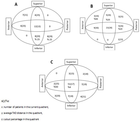 Percentage of cut-out complications and mean tip–apex distances (millimeters) for each quadrant. (A). Lateral decubitus position; (B) supine hemilithotomy position; and (C) traction table.