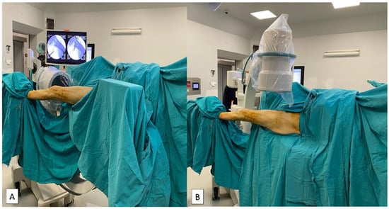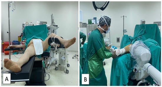 (A) Intraoperative view and (B) C-arm setup of intramedullary nailing facilitated by manual traction applied by a surgical assistant in the supine hemilithotomy position.