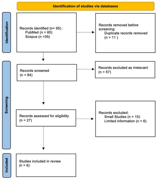 Process of elimination and inclusion of studies for review. After conducting a PubMed and Scopus search, a total of 95 articles were reviewed, out of which 11 were removed as duplicates, 57 were deemed irrelevant, and 21 were excluded due to limited information and small sample sizes. Finally, 6 studies were deemed suitable and included in the final review. PRISMA flow diagram [].